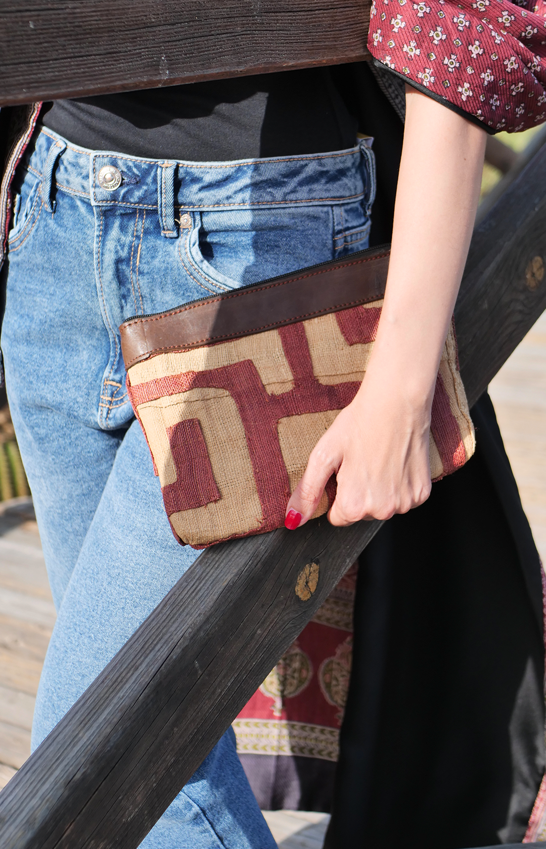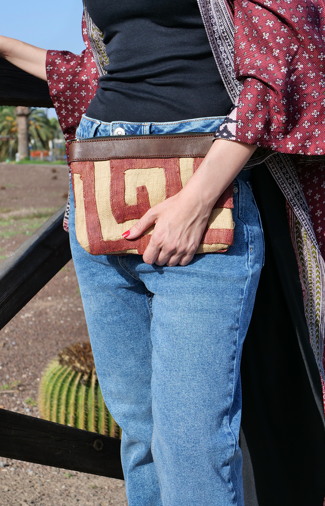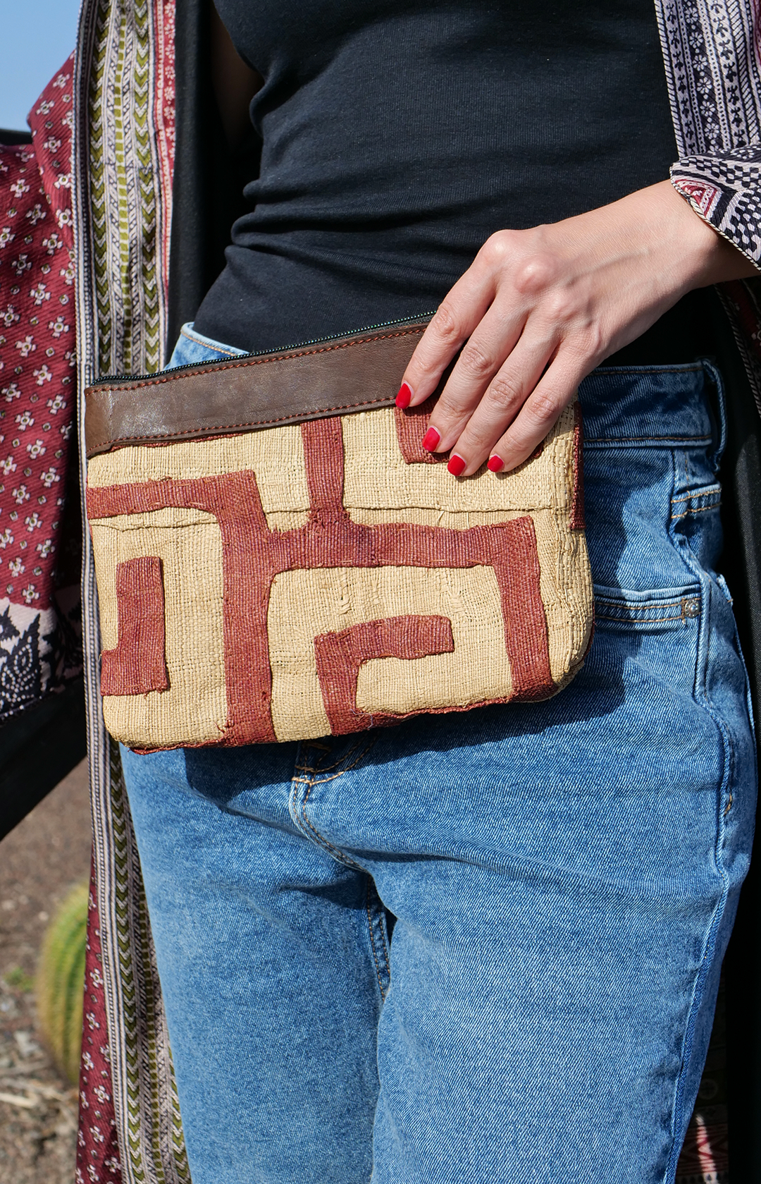 The BAKUBA BURGUNDY pochette is crafted from Bakuba fabric and recycled leather, merging tradition with sustainability. Bakuba is a rare, handwoven raffia textile from the Democratic Republic of the Congo, traditionally crafted by the Kuba people and known for its intricate geometric patterns and cultural symbolism.