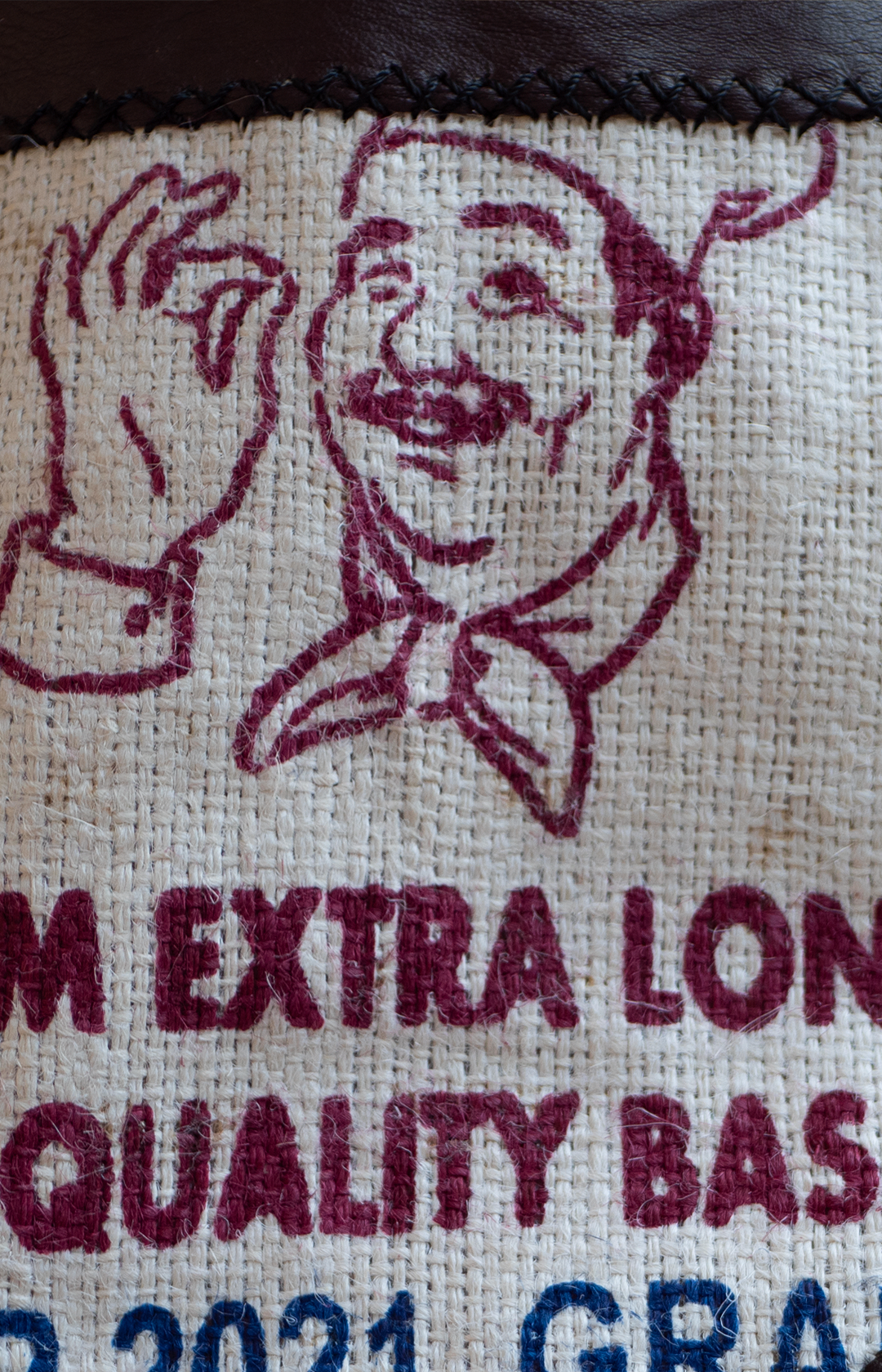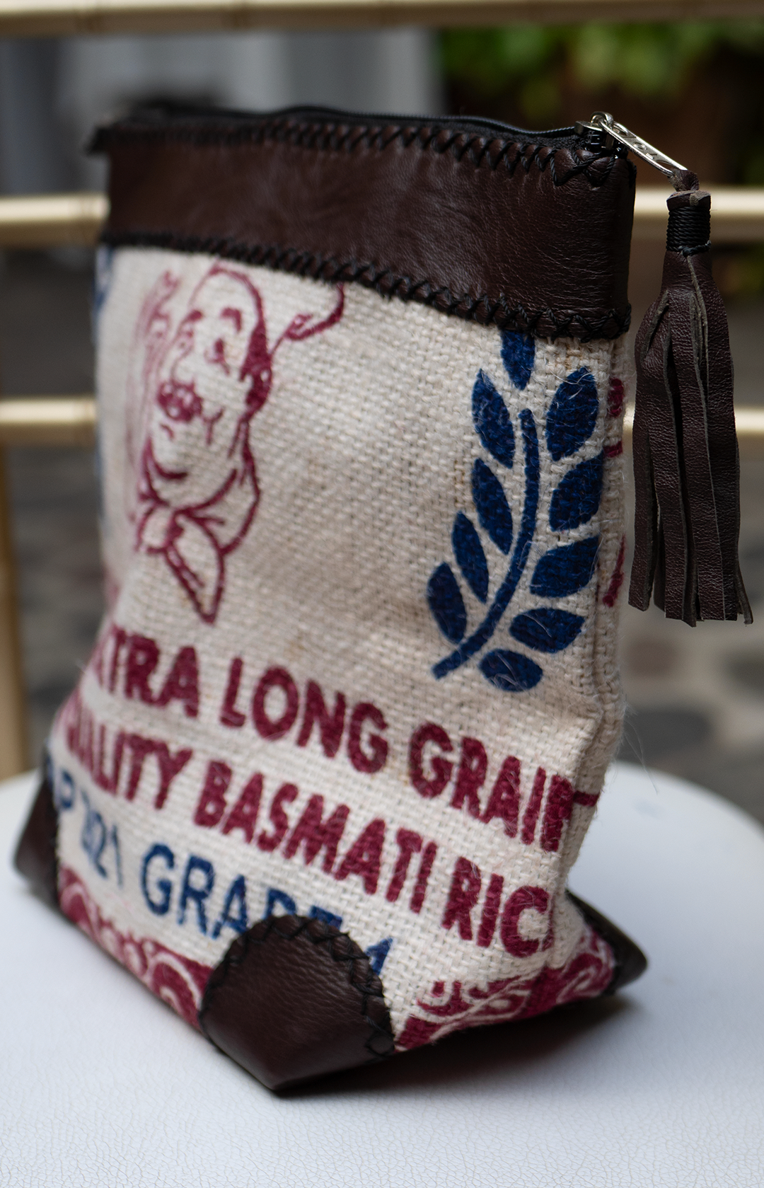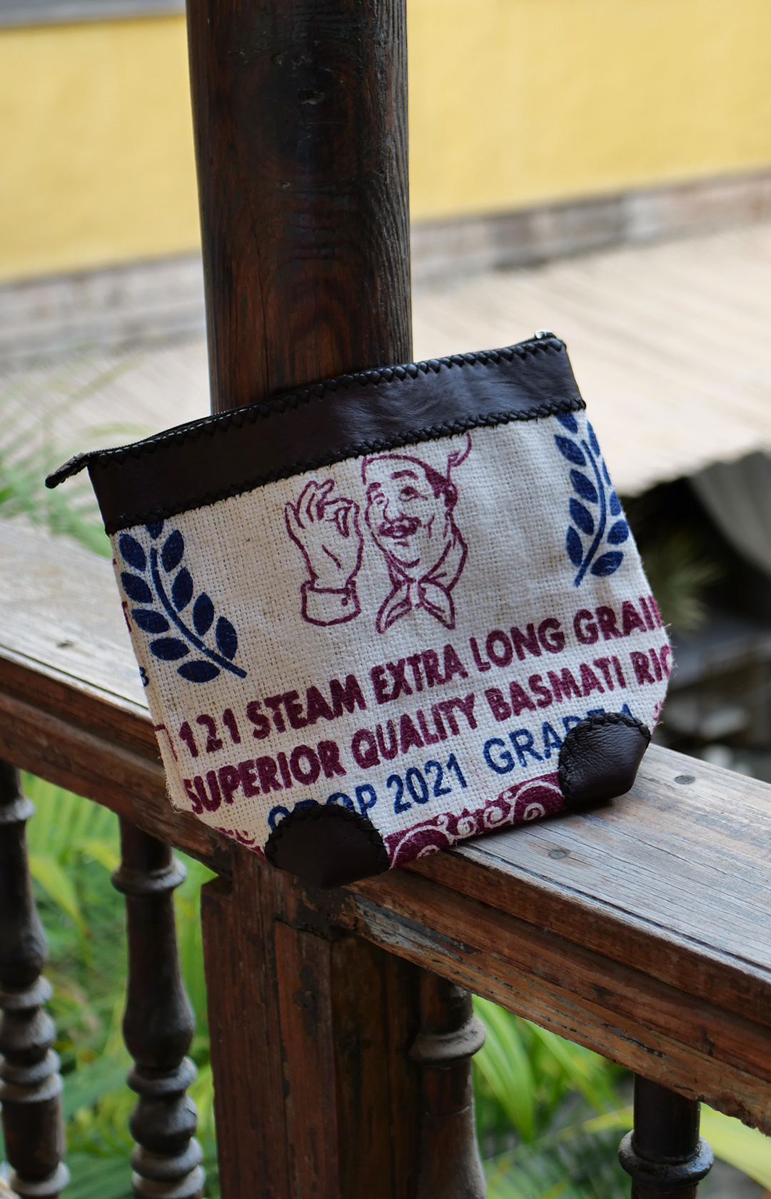 The KAHAWA pouch is crafted from raffia rice sacks and recycled leather, merging sustainability with artisanal heritage. Raffia is a natural fiber derived from the leaves of the raffia palm, traditionally used across Africa for weaving textiles and crafting durable, lightweight materials.