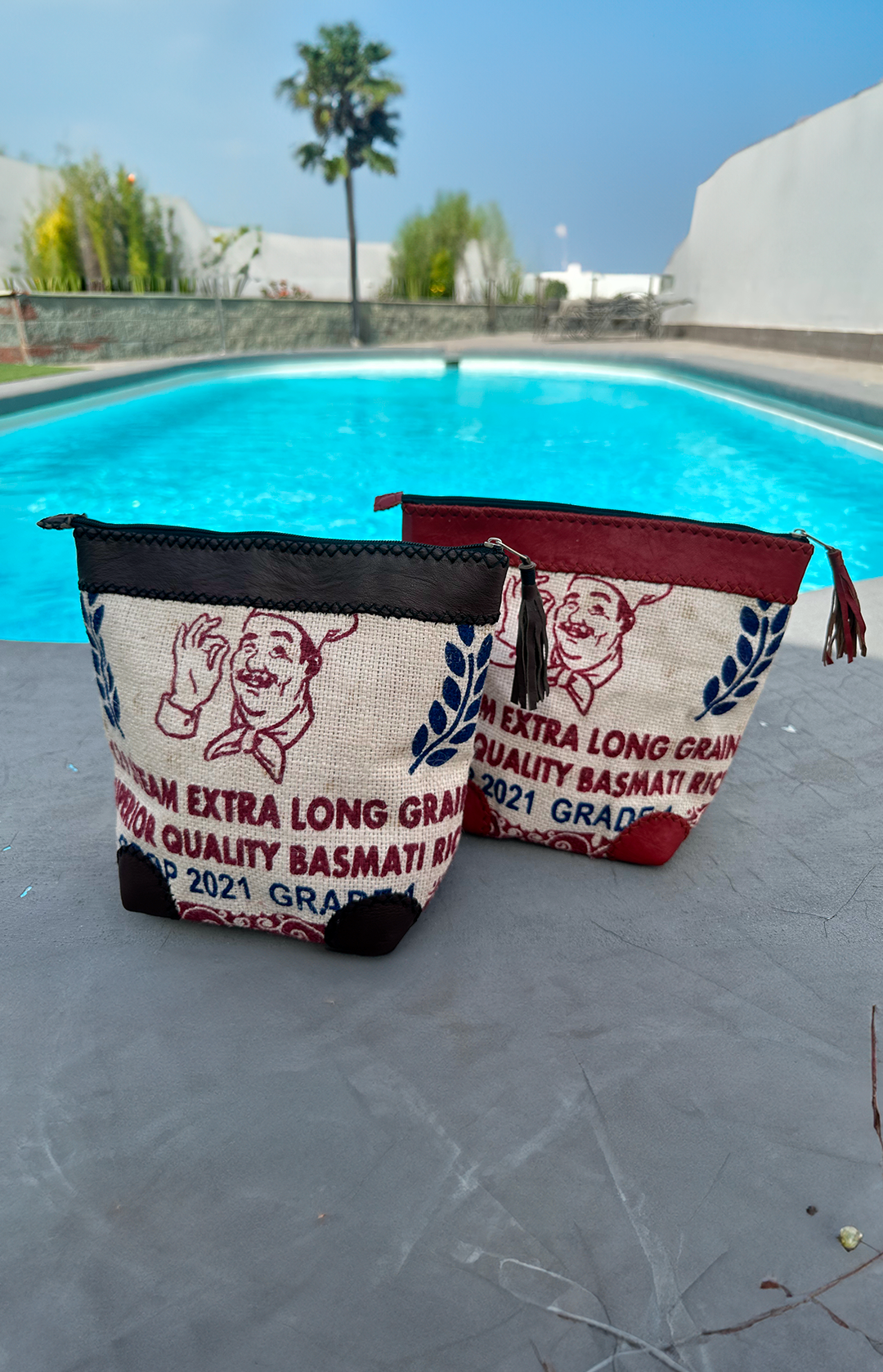 The KAHAWA pouch is crafted from raffia rice sacks and recycled leather, merging sustainability with artisanal heritage. Raffia is a natural fiber derived from the leaves of the raffia palm, traditionally used across Africa for weaving textiles and crafting durable, lightweight materials.