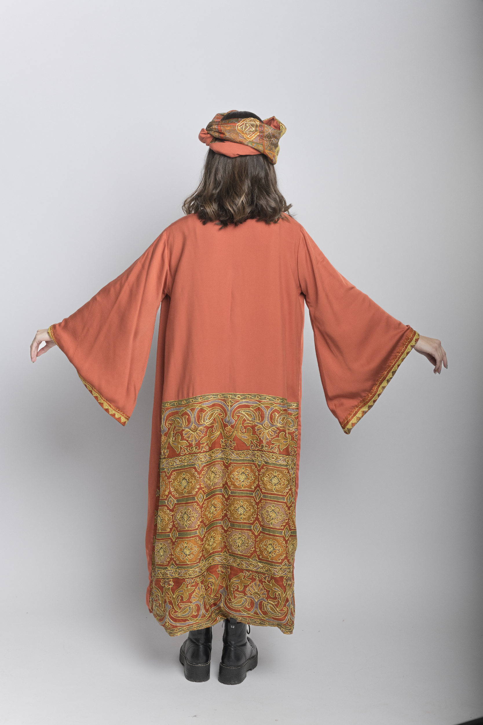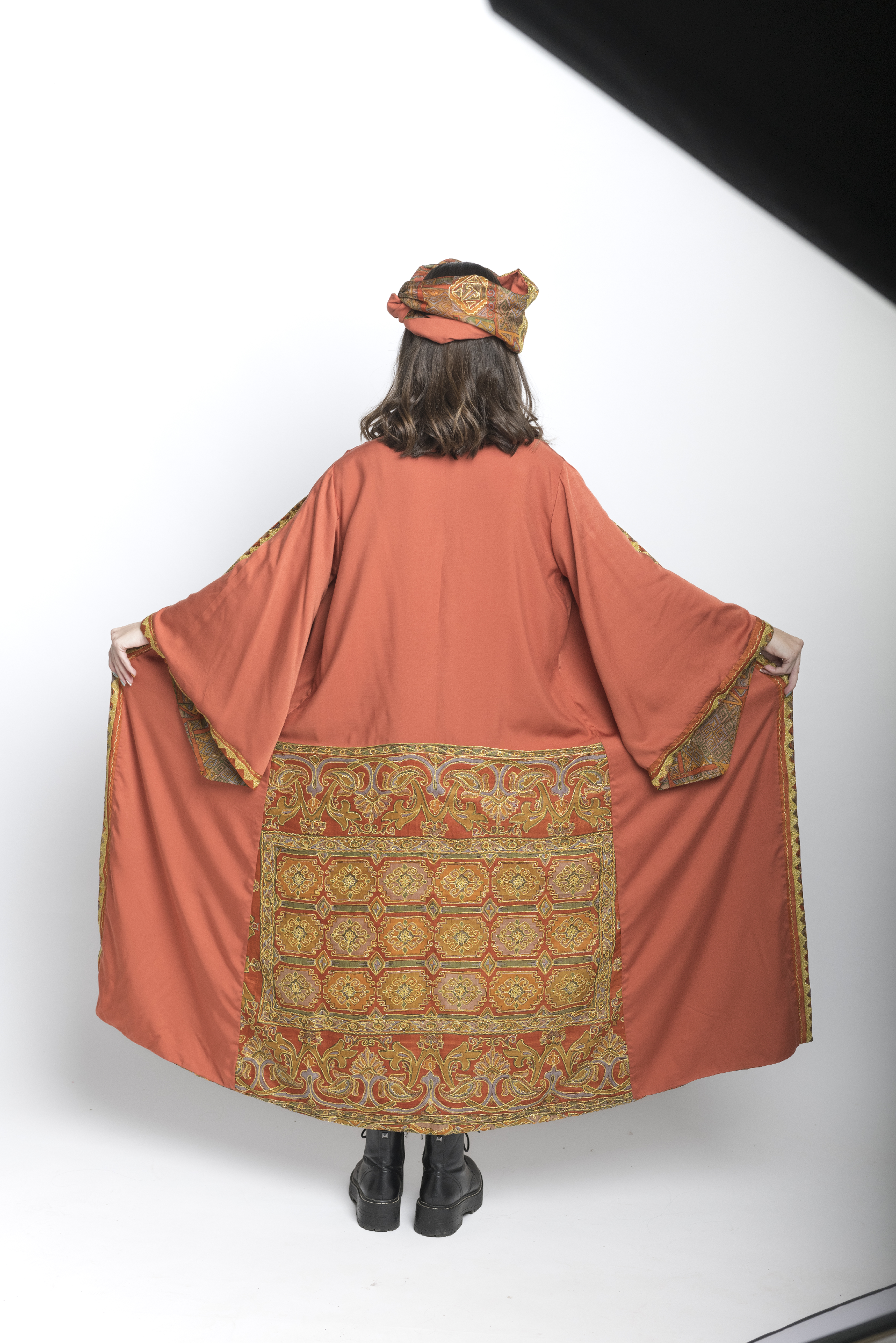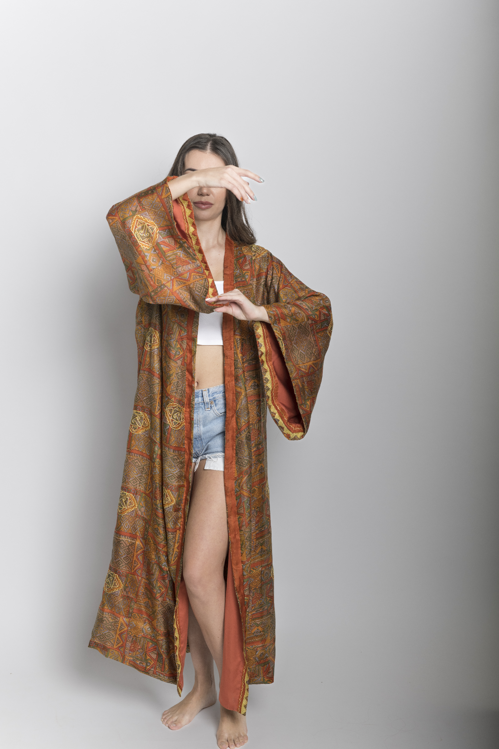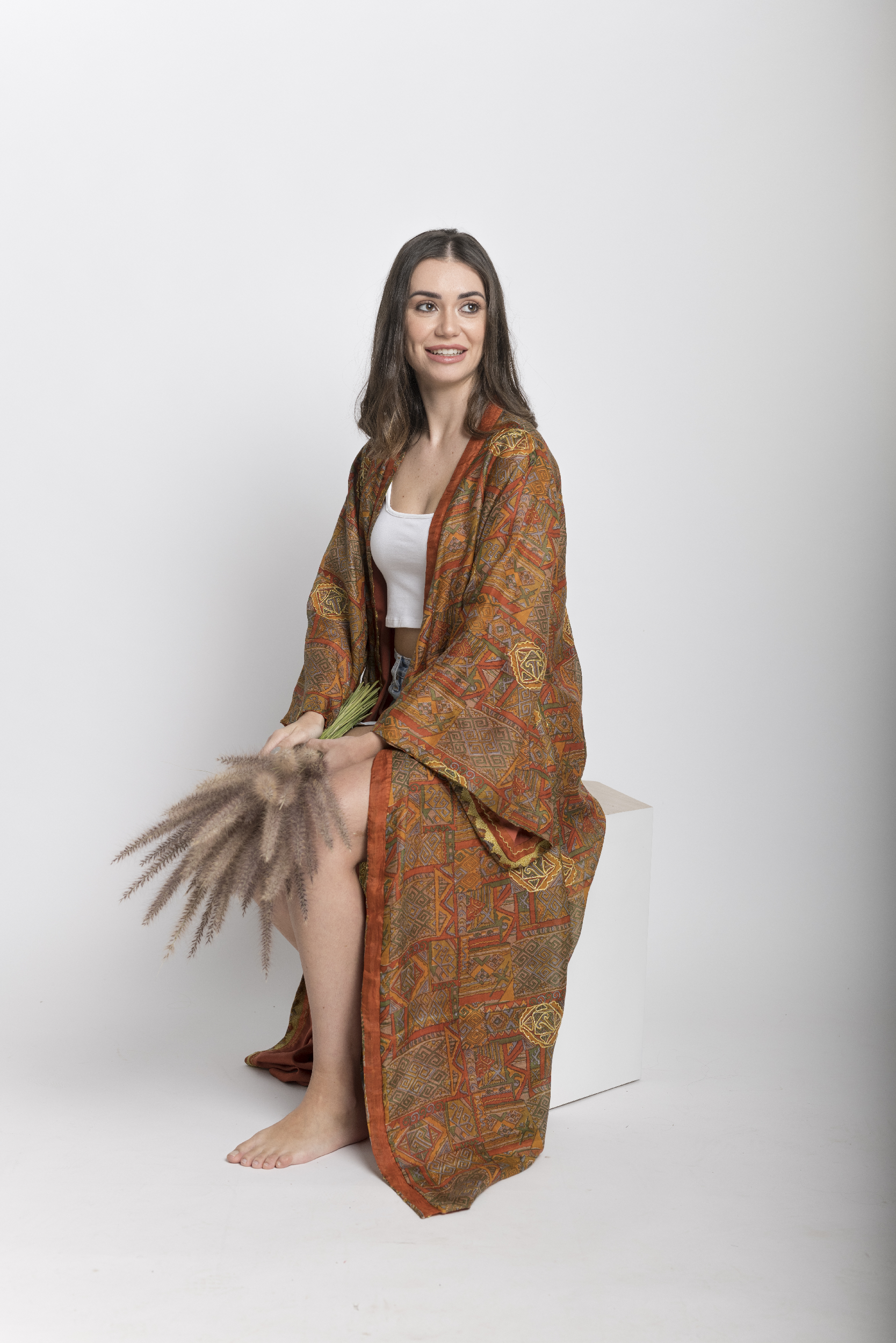 Discover the unparalleled elegance of the Reversible Kimono Orange Desert , a true one-of-a-kind masterpiece. Crafted from 100% pure silk, carefully sourced from antique sarees, this kimono is a luxury statement piece that embodies craftsmanship, sustainability, and timeless beauty. Every stitch is meticulously hand-sewn by skilled Italian artisans, ensuring exceptional attention to detail—even the thread used is pure silk.