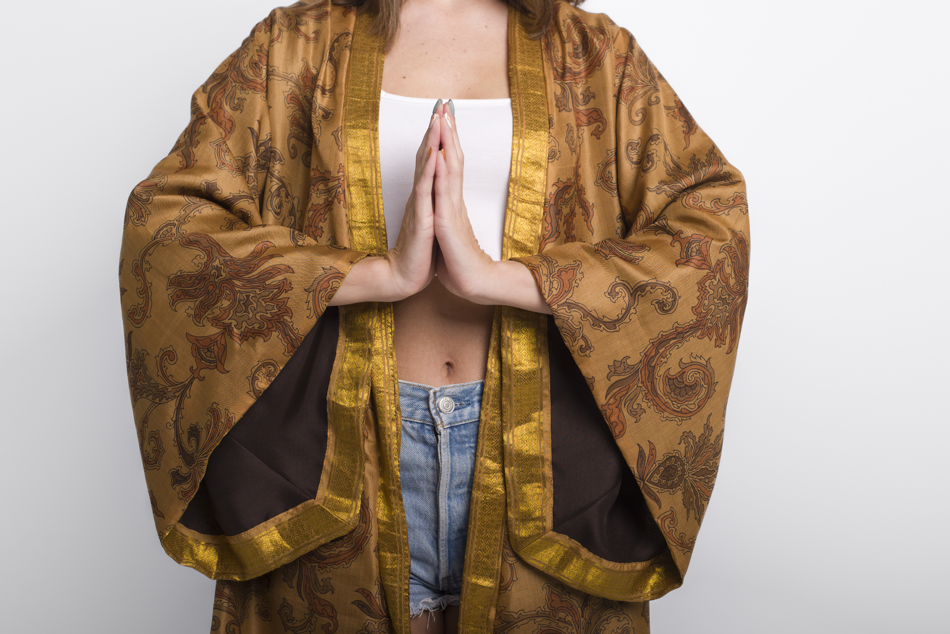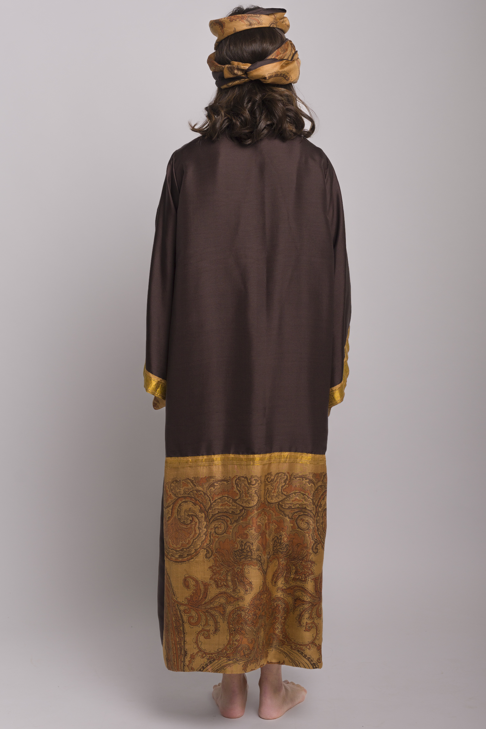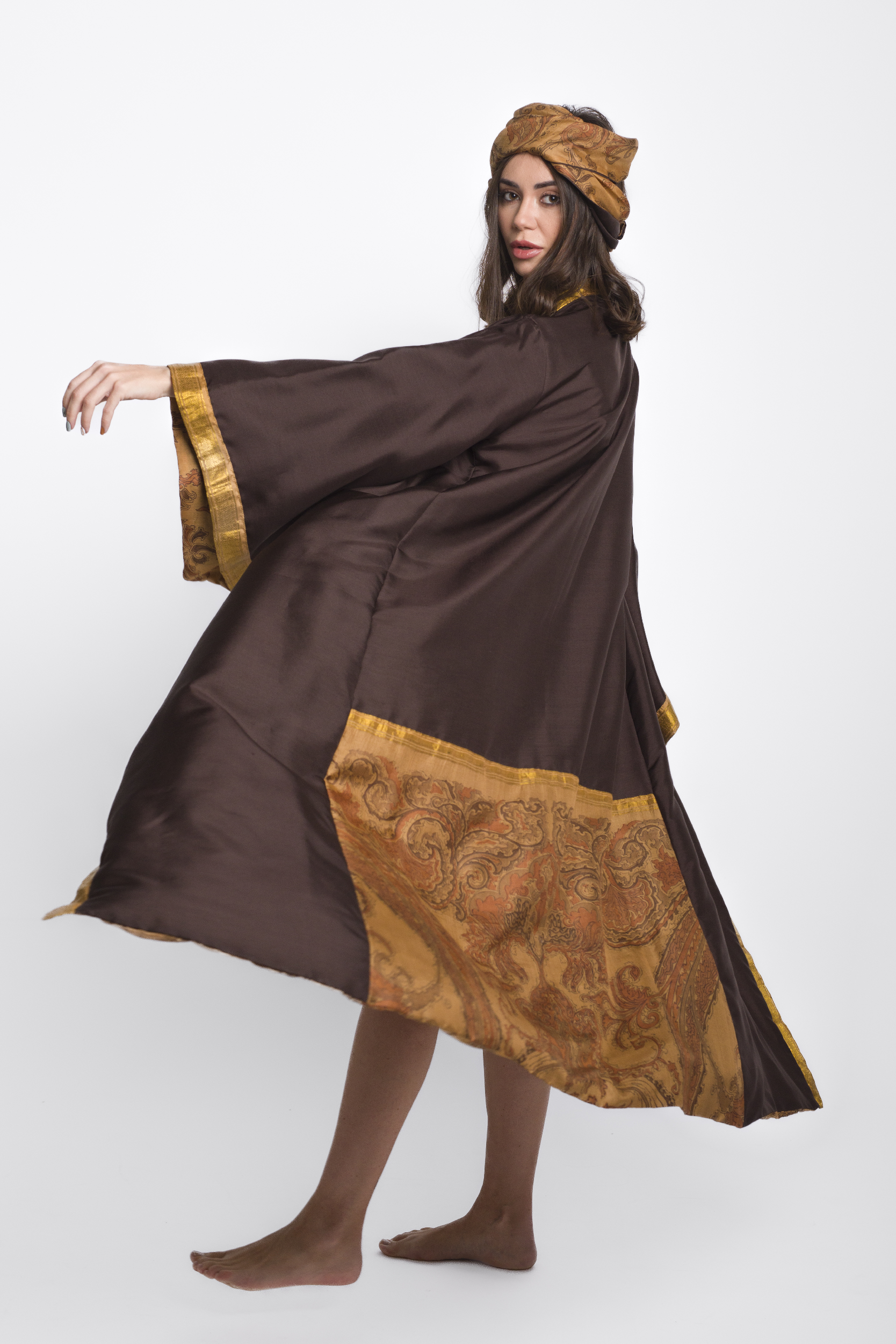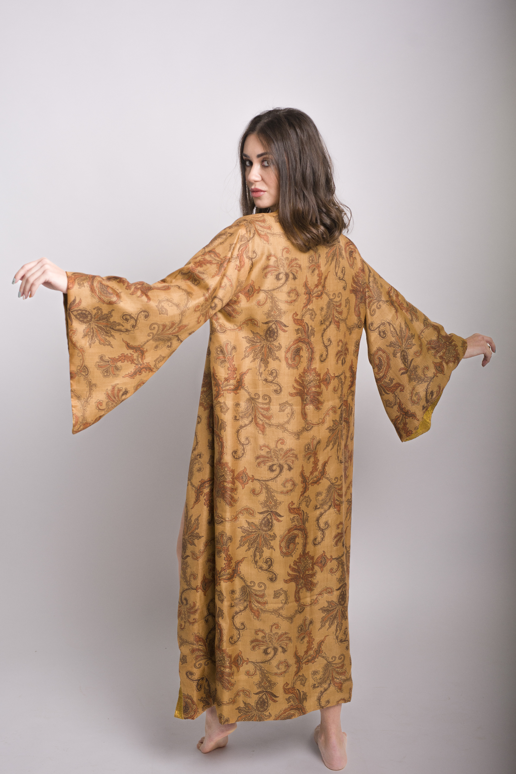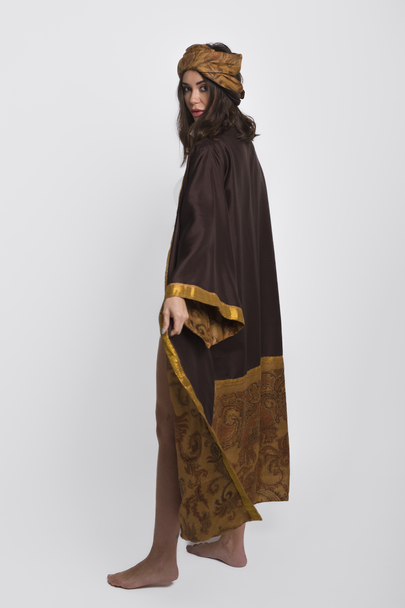 Discover the unparalleled elegance of the Reversible Kimono Coffee , a true one-of-a-kind masterpiece. Crafted from 100% pure silk, carefully sourced from antique sarees, this kimono is a luxury statement piece that embodies craftsmanship, sustainability, and timeless beauty. Every stitch is meticulously hand-sewn by skilled Italian artisans, ensuring exceptional attention to detail—even the thread used is pure silk.