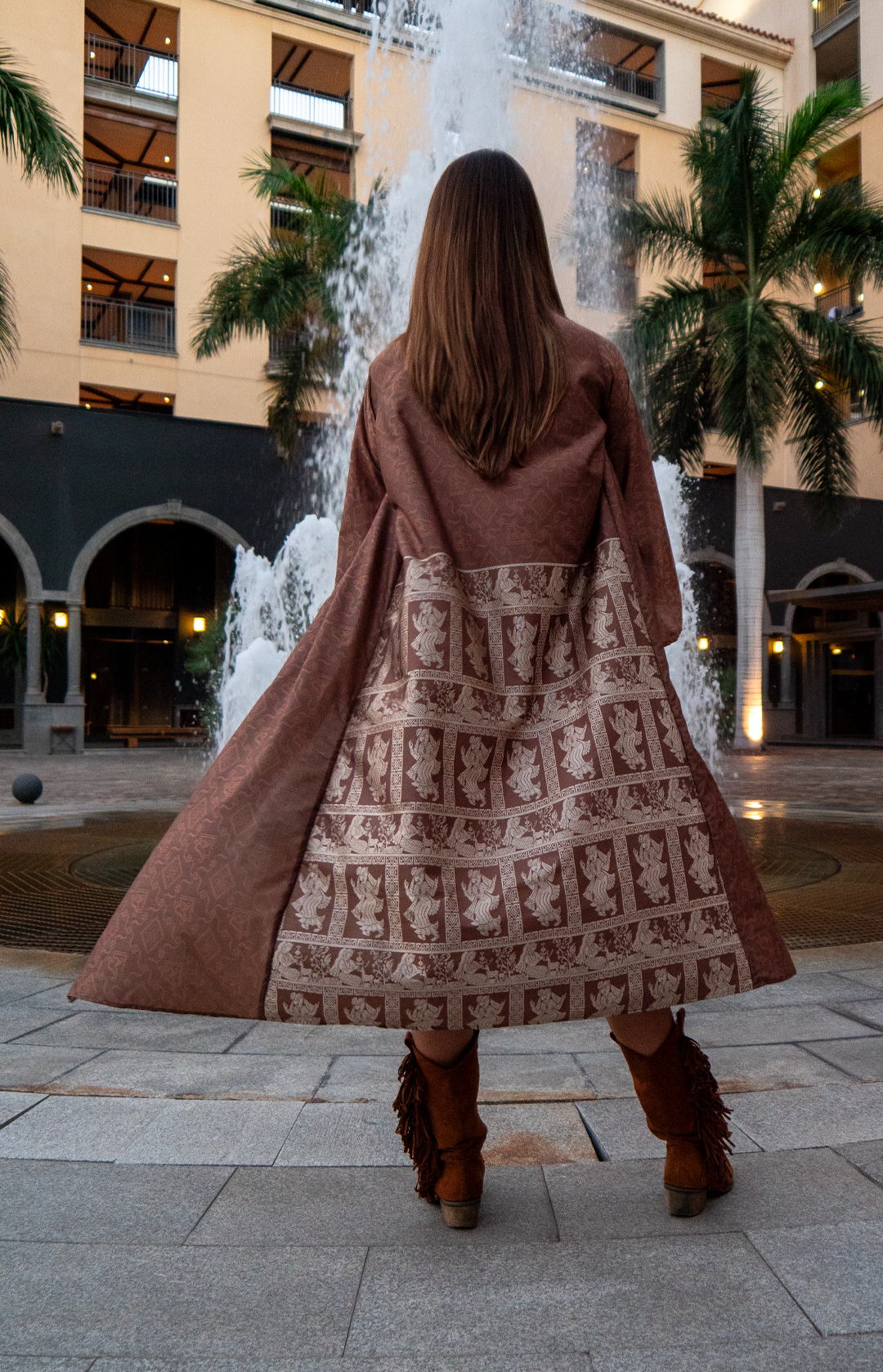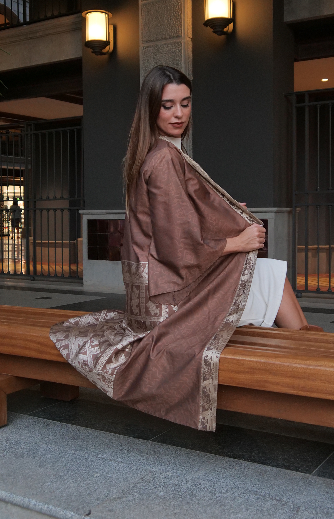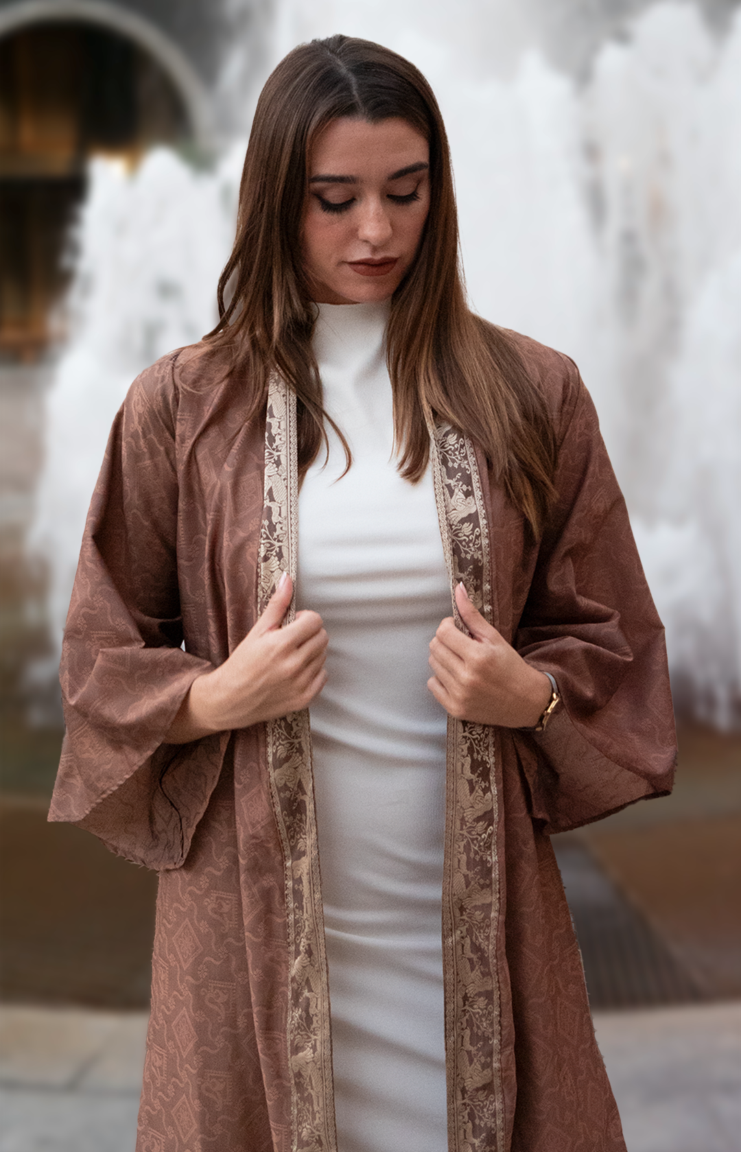 Discover the unparalleled elegance of the Reversible Kimono LAS PALMAS, a true one-of-a-kind masterpiece. Crafted from 100% pure silk, carefully sourced from antique sarees, this kimono is a luxury statement piece that embodies craftsmanship, sustainability, and timeless beauty. Every stitch is meticulously hand-sewn by skilled Italian artisans, ensuring exceptional attention to detail—even the thread used is pure silk.
