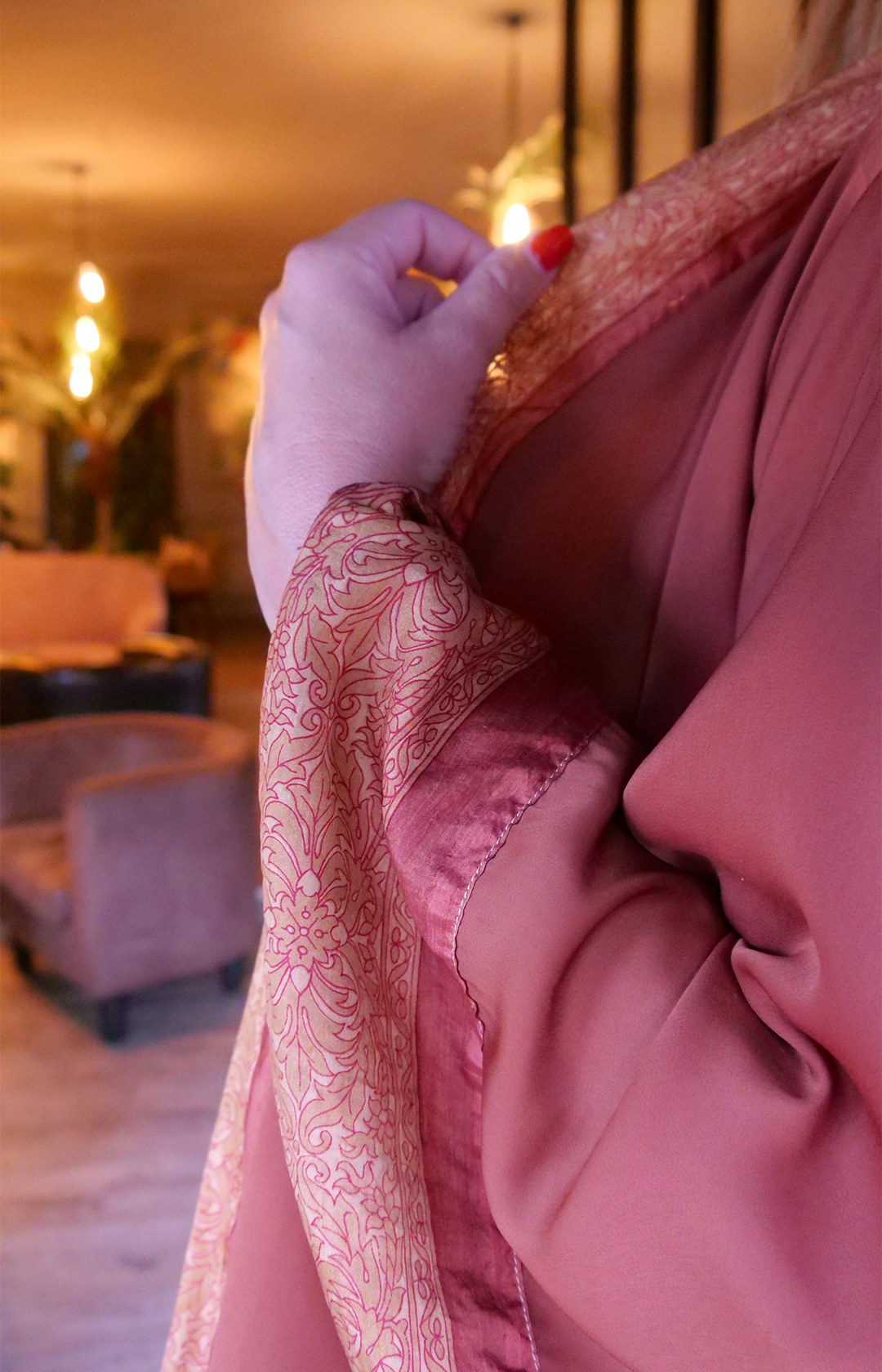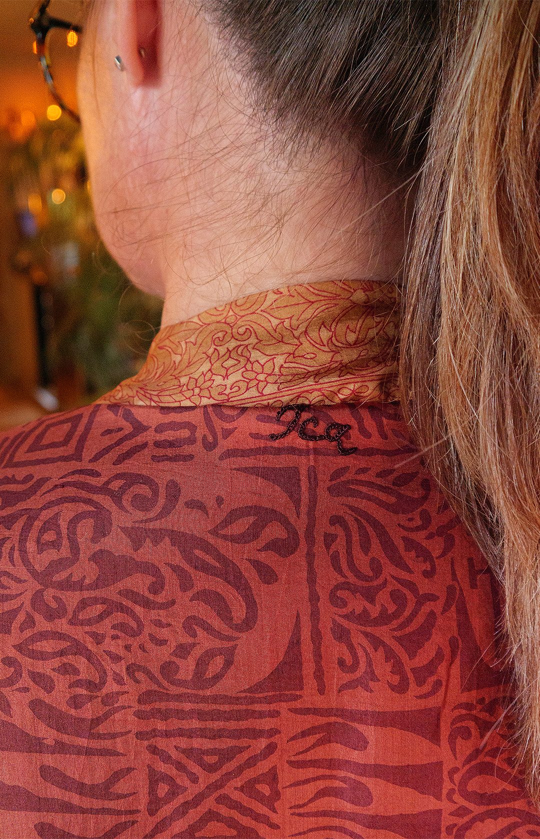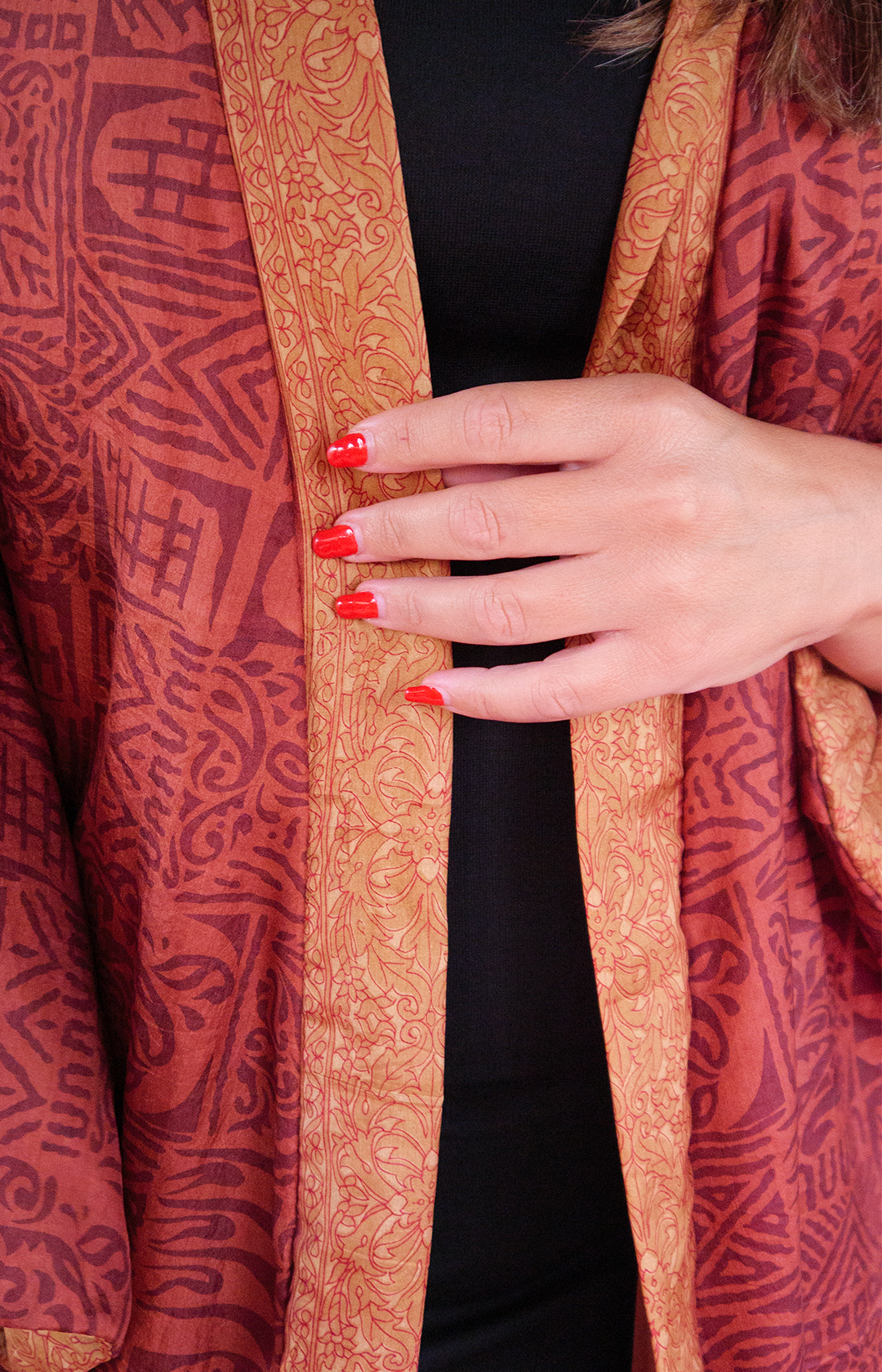 Discover the unparalleled elegance of the Reversible Kimono Kinshasa, a true one-of-a-kind masterpiece. Crafted from 100% pure silk, carefully sourced from antique sarees, this kimono is a luxury statement piece that embodies craftsmanship, sustainability, and timeless beauty. Every stitch is meticulously hand-sewn by skilled Italian artisans, ensuring exceptional attention to detail—even the thread used is pure silk.