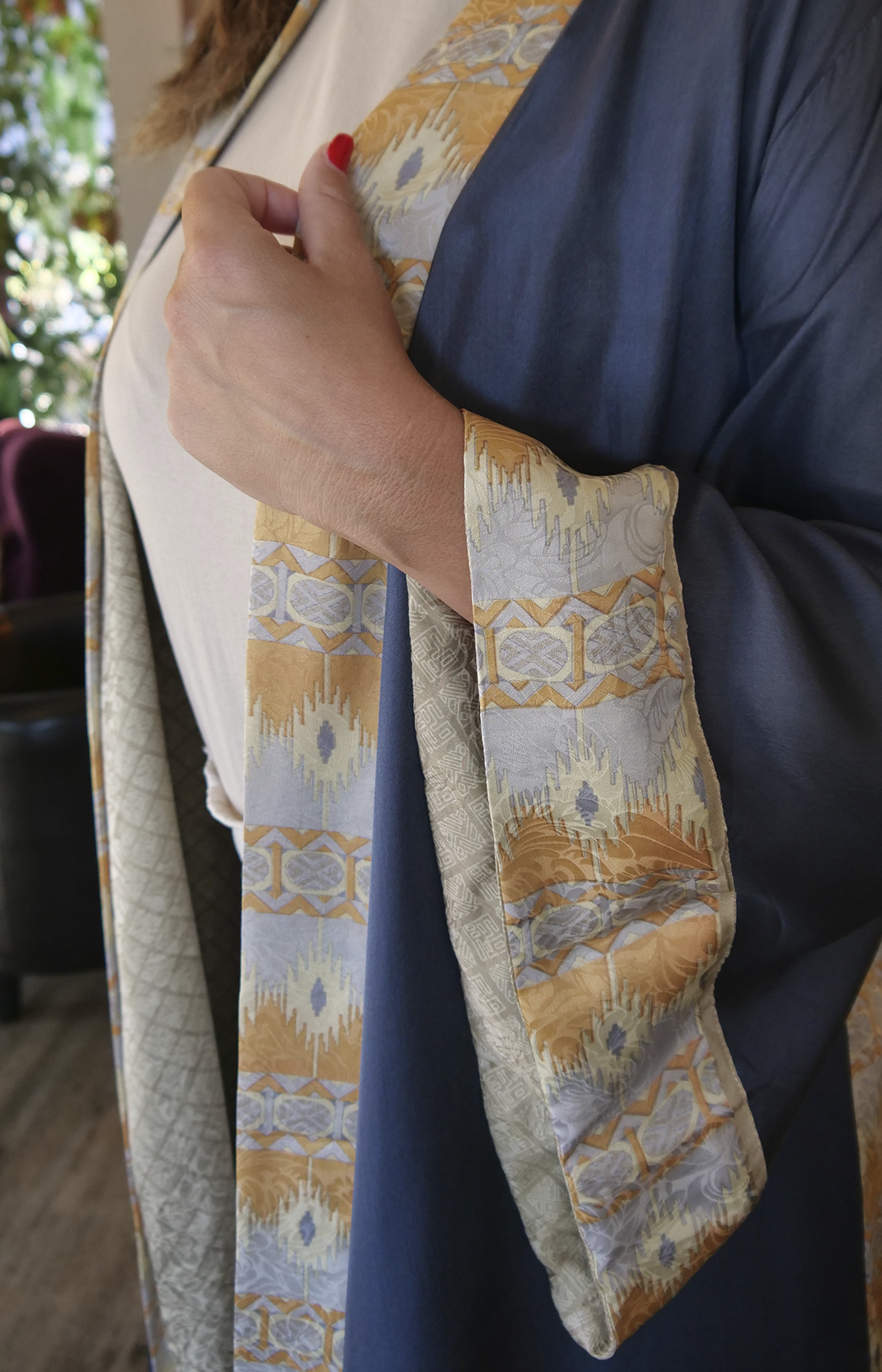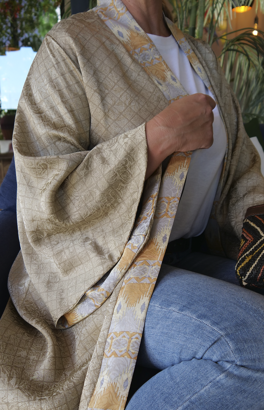 Hecho completamente a mano con seda vintage. Dado que parte de la tela es antigua, el tiempo puede haber dejado rastros que le dan un toque distintivo a cada kimono. No son defectos, sino reflejos de su rica historia y alma.