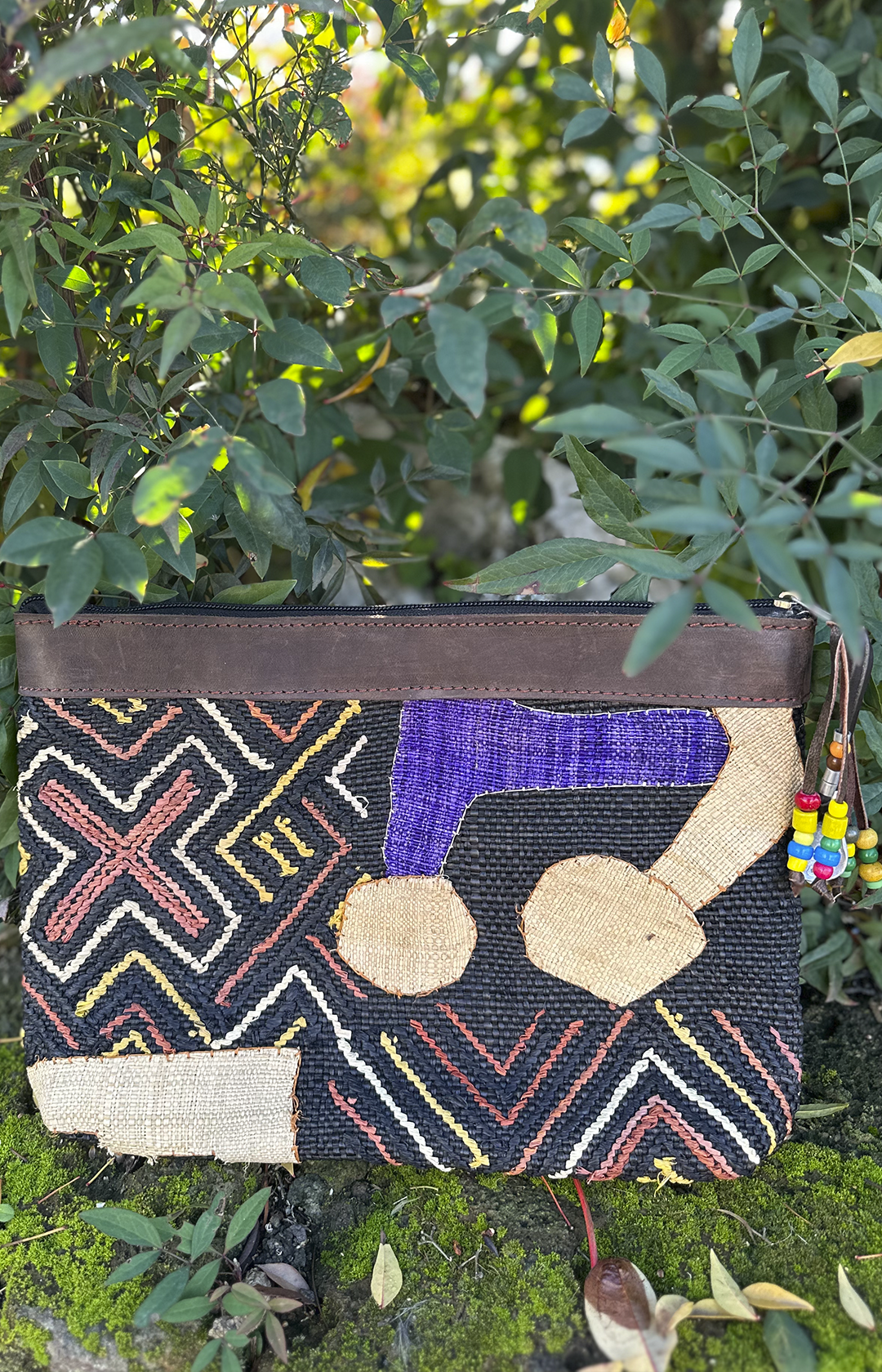 The MATUMAINI pochette is crafted from Bakuba fabric and recycled leather, merging tradition with sustainability. Bakuba is a rare, handwoven raffia textile from the Democratic Republic of the Congo, traditionally crafted by the Kuba people and known for its intricate geometric patterns and cultural symbolism.
