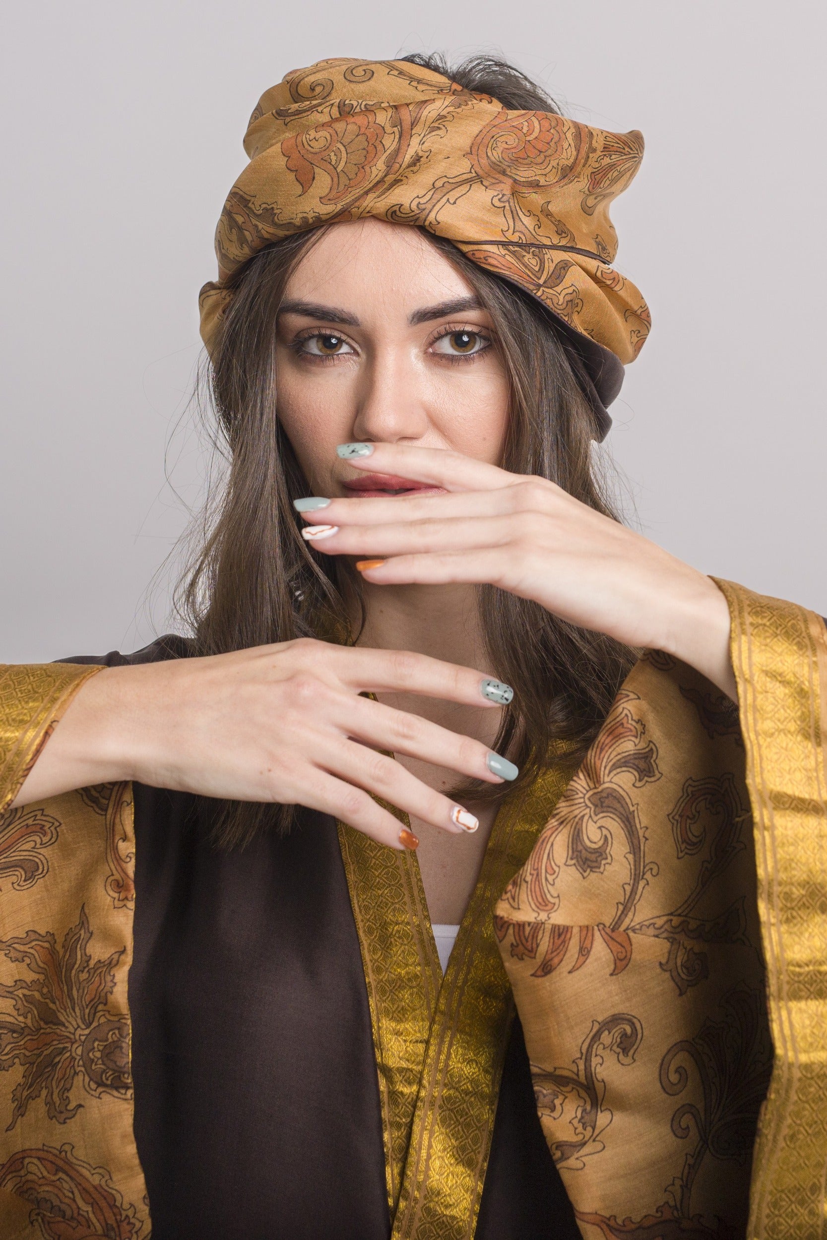 Discover the Shapeable Headband Coffee, an exclusive, one-of-a-kind accessory crafted with exceptional artistry. Made from 100% pure silk, carefully sourced from antique sarees, each headband is a unique masterpiece. Unlike mass-produced fabrics, the silk paired with each saree is hand-selected by skilled Italian artisans, ensuring unmatched quality and attention to detail—even the stitching is done with pure silk thread.