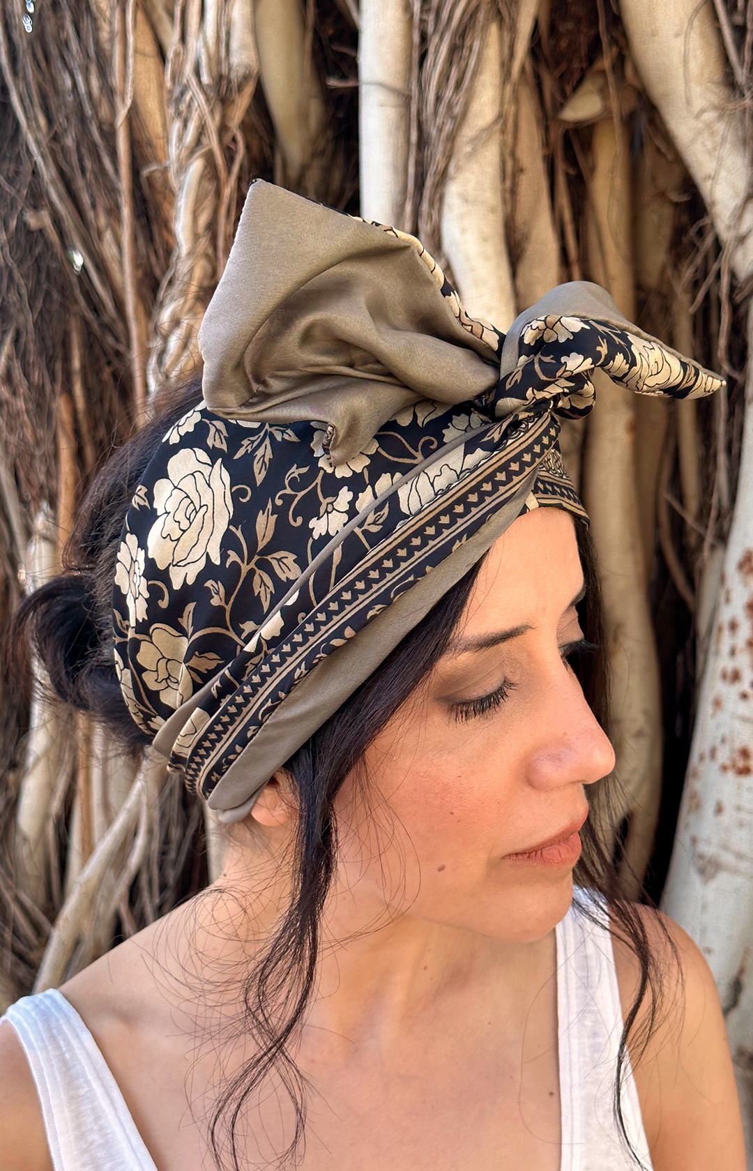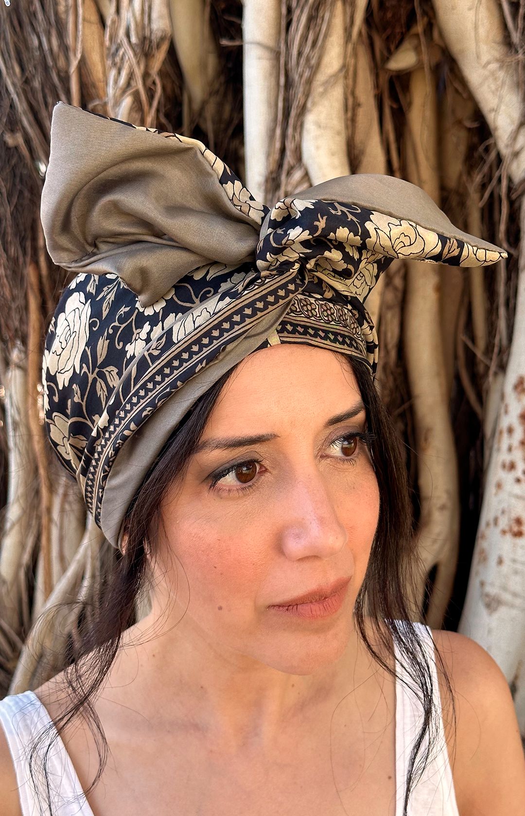 Discover the Shapeable Headband Pamplona, an exclusive, one-of-a-kind accessory crafted with exceptional artistry. Made from 100% pure silk, carefully sourced from antique sarees, each headband is a unique masterpiece. Unlike mass-produced fabrics, the silk paired with each saree is hand-selected by skilled Italian artisans, ensuring unmatched quality and attention to detail—even the stitching is done with pure silk thread.