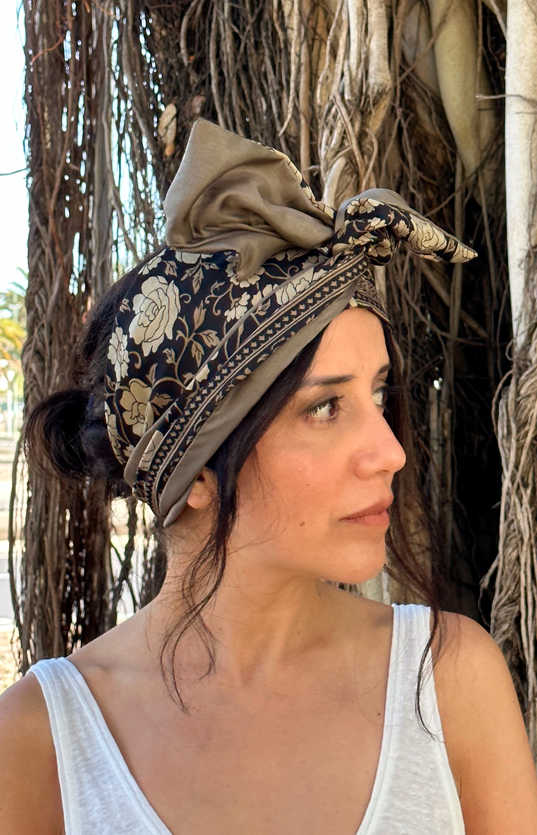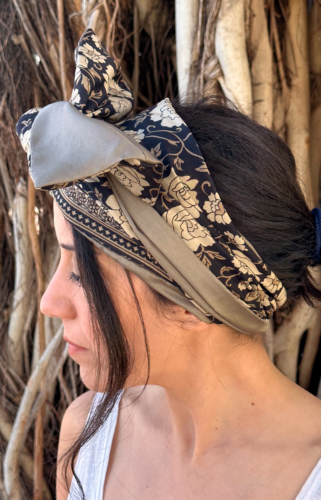 This reversible headband offers two distinct looks in one, with different patterns on each side. Made from noble natural fibers, the breathable silk provides lightweight comfort and elegance. Thanks to its flexible structure, it can be shaped to create multiple styles, adapting to any occasion with effortless sophistication.